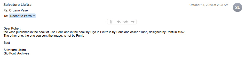 What we know so far is that this vase was falsely attributed to Gio Ponti for over 20 years, and according to a French auction house, is now finding a new creator under the name of Lino Sabattini. The client tried profusely to reach the auction house via email, but got no response, and like previously mentioned, he ended up contacting Docantic to get more information on this vase. We started off by checking the bibliographical references in the Docantic library, the ones that all the auction houses show off in order to assign this vase to Gio Ponti (Exhibit #3).