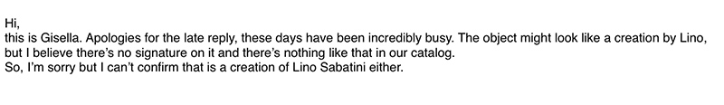 Because we are "cool" by nature, we took the initiative to email the auctioneer in charge of the sale in question, to attest to the true identity of the artist of said vase, who is not Lino Sabattini, but unfortunately it was our turn this time to be left on read...The day of the sale, despite our numerous alerts, the vase was presented by the auctioneer as one of Lino Sabattini's artworks, and evidently was not sold. This kind of behavior does not surprise us one bit...