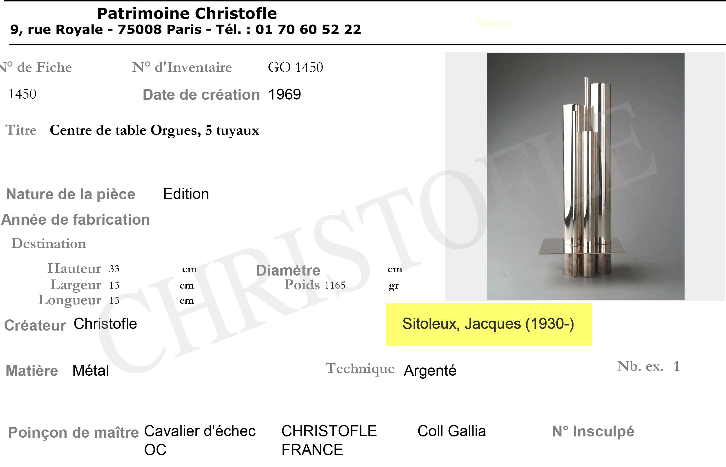This investigation was not a difficult one to solve as the resources needed were available to anyone, all we had to do was reach out to the right people instead of being a sheep and blindly following the pack..Today we can indeed confirm that this vase is neither from Gio Ponti nor Lino Sabattini, but is from none other than Jacques Sitoleux. We do however need to underline something of importance here; instead of attributing the vase left and right to random artists hoping for the highest value, it would be wiser to know the real history behind it. This vase is apart of a very important collection launched by Christofle in the 60s by Henri Bouilhet, who was the head of the company back then. After expressing their interest in coming up with a modern, avant-garde collection Christofle proceeded to create the Collection Christofle Contemporain. This collection was supposed to solely be made out of contemporary materials, without the use of any specialized equipment/tools, something that would be easily comparable to Jean Prouvé. This "Orgues" vase, made out of tubes and a metal plate, followed the rules of this program to a T. This collection only called for artists with a more modern twist. Jacques Sitoleux, is in fact the creator/designer chosen by Christofle in order to bring the Christofle Contemporain collection to life. He will later be assisted on some models by Francois Pautre.