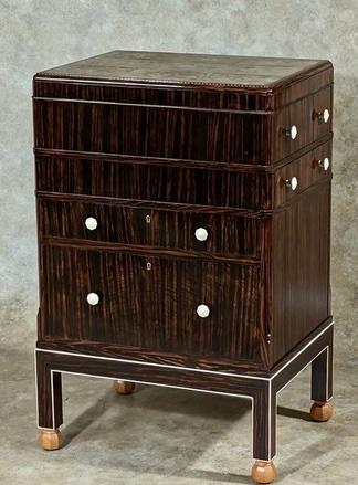 "macassar, shagreen, ivory cabinet - likely for silverware/cutlery. Possibly Jallot if french or Heal & Son if english. Not signed. Looking for clear attribution to a maker. thank you!"